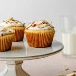 Make the frosting. Stir the yogurt, almond extract, and maple syrup together. To frost, place a small 1 tablespoon dollop on top of the cupcake. Lightly spread to the edges using a small spoon and top with almond slivers.