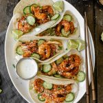 These are seriously the best Korean Shrimp Tacos! They're loaded with spicy gochujang marinaded shrimp, homemade lime crema, and all your favorite toppings. It's delicious, easy, and great for a crowd!