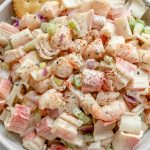 This Seafood Salad is light, creamy, and best served cold. It's made with flakey imitation crab, bite-size shrimp pieces, and fresh vegetables. Perfect as a side dish, snack, or lunch!