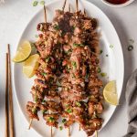 Thread pork onto skewers, leaving a little space between each one and double threading when possible. To double thread, pierce skewer through one end of the pork, twist the meat, and pierce the skewer through the other end of the pork as well. Evenly spread the skewers out onto the baking sheet.