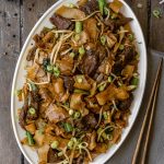 Vietnamese Flat Rice Noodles with Beef, or Hu Tieu Ap Chao, is one of my childhood favorites! It strongly resembles Beef Chow Fun with its wide chewy rice noodles, sweet and savory black sauce, and tender bites of beef. This dish is easy, comforting, and delicious!
